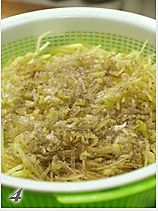 土豆丝加盐,葱花,黑胡椒拌匀,静置一会儿,沥干析出的水分。