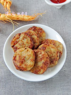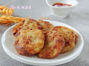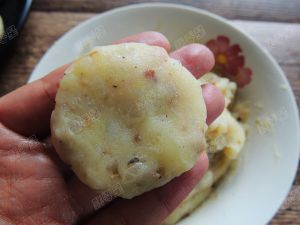 火腿丁,香菇丁倒入土豆泥中,搅拌均匀,然后弄成一个个小饼状,粘上面粉,在黏上蛋液,锅里放油,油温时,土豆饼放锅里煎,两面煎黄,出锅就ok啦,
