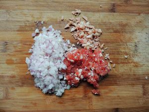 用捣蒜锤把土豆捣碎,成泥状加入盐,这样吃起来有点味道,不然不咸不淡的不好吃,会腻,