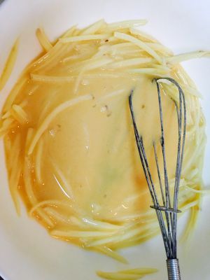 土豆切成土豆丝 或者刷成土豆丝 放适量面粉 打个鸡蛋 加点水 放入盐 鸡精 味精 根据个人口味调味 我用的是最简单的