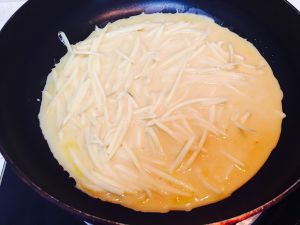 入锅后将一面煎到焦黄为止 才能定型 翻另一面 特别建议煎薄一点 我放的两个小土豆一下子全进去了 煎的很厚啊!不太好熟 中间还容易焦 宁可多煎几次不要偷懒哦