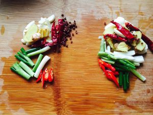 青红辣椒切碎,姜切丝,蒜拍碎,葱切段,洋葱切小块。
