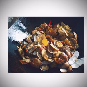 一定用大火爆炒,倒入花椒水,一点点老抽,再加一点点耗油、海鲜酱油,一直翻炒,直到花蛤全部张开,出锅。