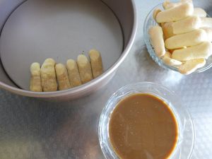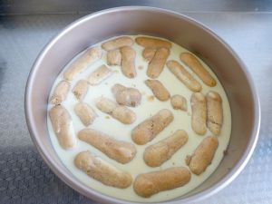 重复这个过程,直到蛋糕圆模底部铺满手指饼干后,倒入一半的马斯卡彭奶酪糊;
