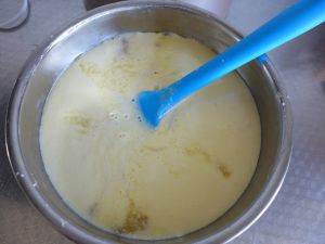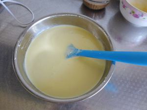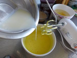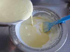 将煮沸的牛奶缓缓倒入打发的蛋黄中,一边倒入一边用打蛋器搅打,连续搅打8-10分钟,蛋黄糊的温度基本和手温差不多,放在一边冷却备用;