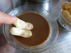 取一片手指饼干,在咖啡酒里快速蘸一下,让手指饼干沾满咖啡酒;