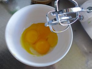 蛋黄液缓慢的倒入糖水中,并不断搅拌,防止蛋黄被烫熟。倒入蛋黄后用电动打蛋器搅打至冷却,备用