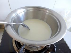 牛奶、细砂糖一起倒入锅中,小火加热煮沸后关火;