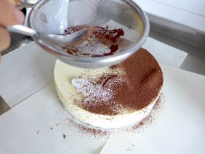 马斯卡彭奶酪糊凝固以后从冰箱取出脱模,表面撒上可可粉做装饰即可;