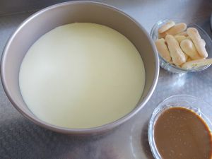 把手指饼沾百利甜酒加咖啡的混合液后,放入六寸模具底,摆满,倒入一半的奶油蛋黄糊,再放入沾咖啡酒的手指饼,继续倒入剩下蛋黄糊。抹平表面,放入冰箱冷藏四小时
