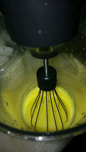 蛋黄加全蛋打散,把4缓缓倒入,一边倒,一边用单抽搅拌降温,全部倒入后搅拌均匀;