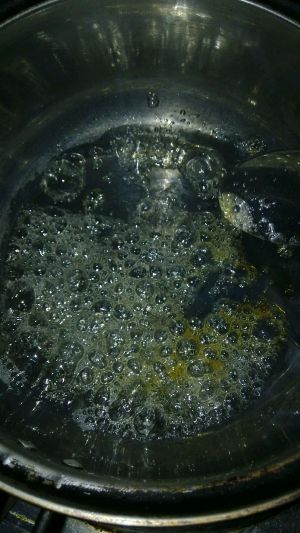 放电磁炉上大火加热,千万不要搅拌,会反砂,至如图状态冒泡时转小火,继续加热。