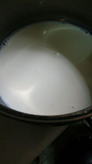 牛奶和20克白糖放入锅中,小火加热至白糖融化就行了