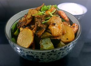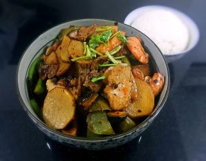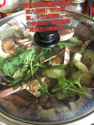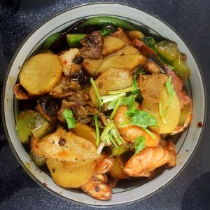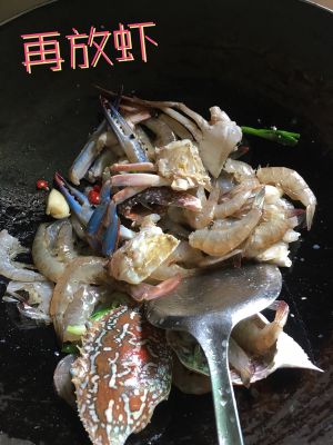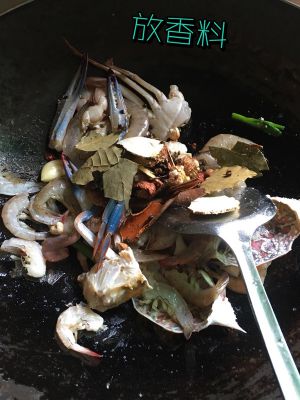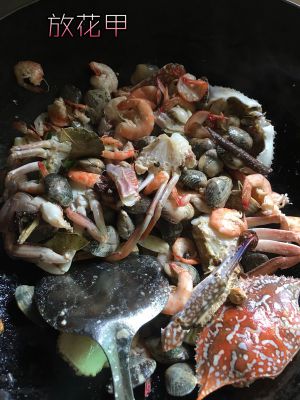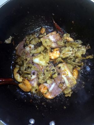 放入圆葱,芹菜煸炒(这两样需要入味所以先放) 准备好的荤素食材通通下锅,加两勺生抽,一勺盐少许蚝油,鸡精,翻炒。