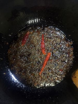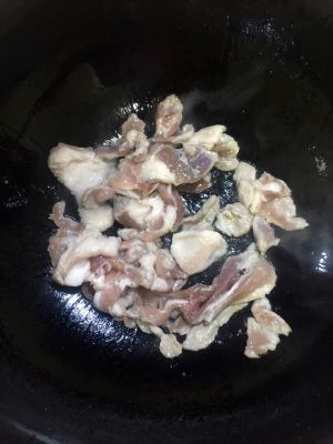 锅内热油,五花肉用淀粉抓匀下锅,翻炒变色,盛出