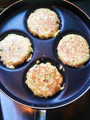 第二步,大火烧平底锅,转小火,舀一勺土豆糊糊,放在平底锅中,我用了懒人平底锅,可以简单做出饼的造型。轻轻晃动锅子,发现饼全部可以移动时候,就翻面,两面煎到微微脆就可以出锅了,这里可以多翻动几次,免得焦掉。