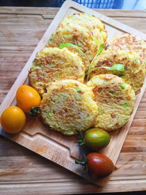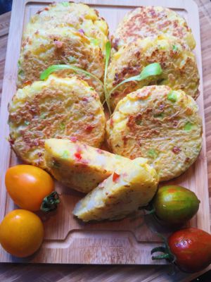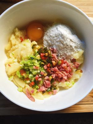 第一步,将土豆蒸熟,捣成泥状,将芦笋火腿尖椒切丁,加一个鸡蛋,适量面粉和温水,适量盐和黑胡椒,搅拌均匀,成糊糊状。