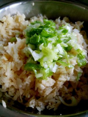 把葱切好放入容器里,然后加入4小勺面粉,一个鸡蛋,盐,鸡精,调拌均匀备用