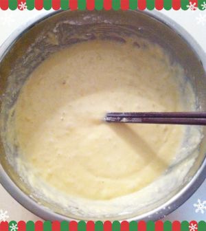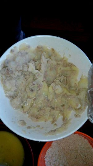 把打好的鸡蛋液倒入土豆泥中一起搅匀、再酌量加入自发粉继续不停的搅,直到成糊泥状。