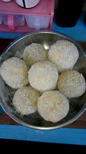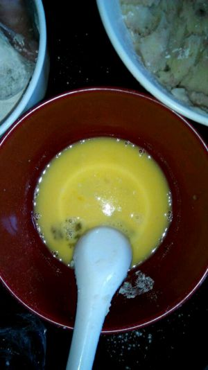 滚完面粉,再滚上一层鸡蛋。(一个鸡蛋就够了)