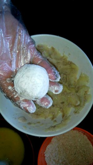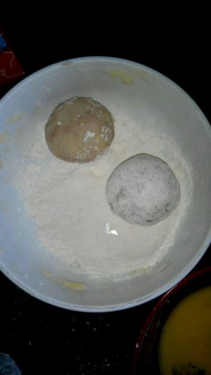 把土豆泥捏成一个小球,然后滚上一层面粉