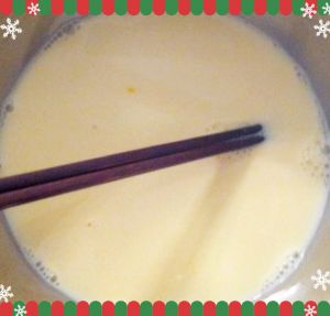 将两个鸡蛋打散、再倒入牛奶、加适量葡萄糖、精盐、蜂蜜、味粉一起搅匀。