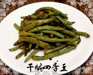 锅内放油,烧热放入花椒,干辣椒,切好的葱姜蒜沫。炒出香味,放入四季豆,大火煸炒。