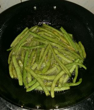 锅里多倒些油,炸豆角,炸至变软,表皮皱皱巴巴的,我炸了大约15分钟。 捞出备用,锅里留少许底油。