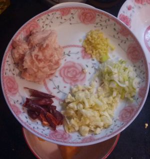 猪肉搅成肉糜,葱姜蒜切成沫,干红辣椒折断去籽。