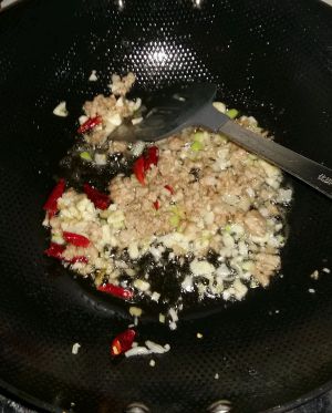 放入干辣椒煸香,炒至肉末干酥,辣椒香辣