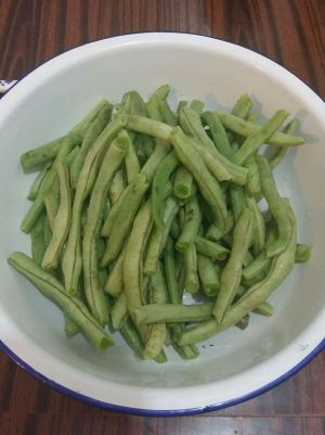 豆角摘好,洗静,手掰成三四厘米左右长度,沥干或用厨房纸吸干水份