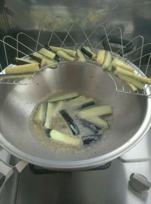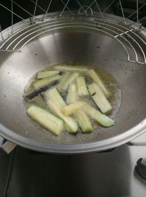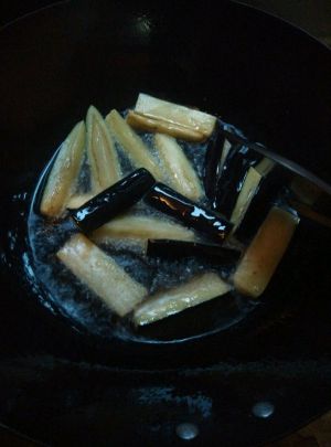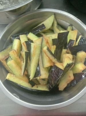 锅烧宽油八成下茄子将表皮炸黄。捞出放蒸箱蒸软去油