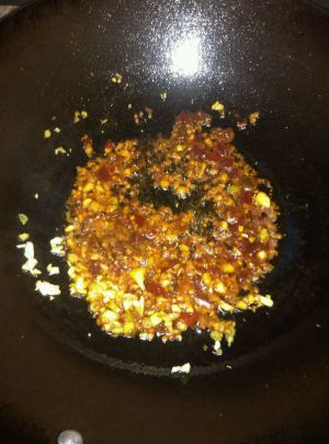 热锅多下些油,下蒜蓉、肉末煸炒香