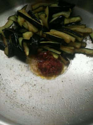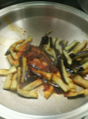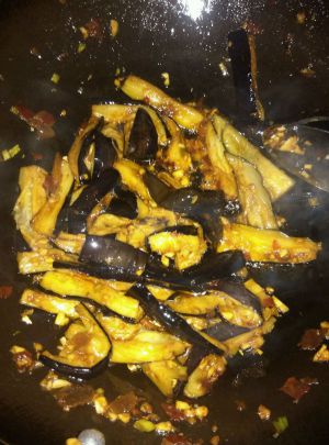 放入茄子继续翻炒,然后放入调好的调料。