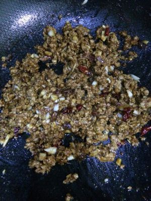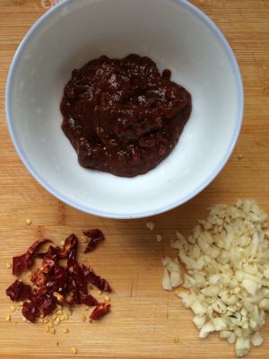 加入豆瓣酱、辣椒,煸炒,再加入蒜末煸炒出香味。