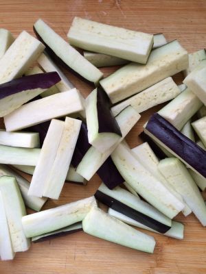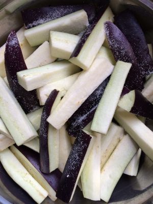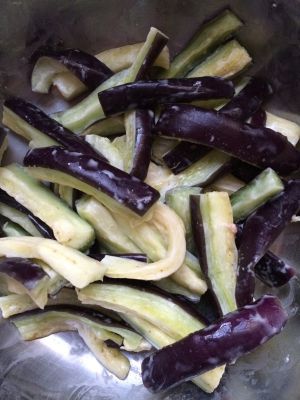 茄子切长条,加入盐,将它们均匀的抹好入味,腌制时间随意。