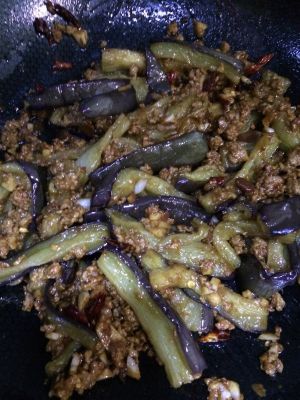 炒个一分钟,再倒入茄子,这中间我没有放盐,因为之前茄子已经抹了盐,豆瓣酱也是咸的