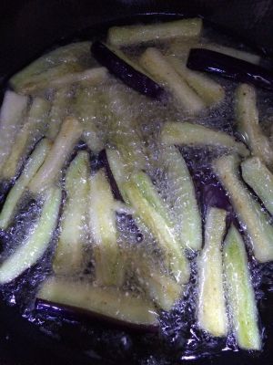 锅中放入适量油,放入茄子炸制微黄即可。捞出备用。