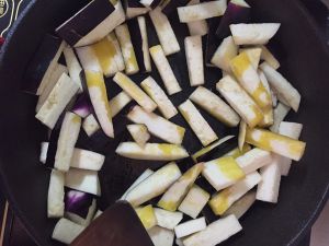 放入茄子段儿,大火炒至变色。加入少许糖,酱油。
