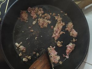 热油,加入大蒜,爆香,放入肉末,加点料酒。