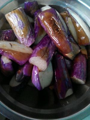 茄子切滚刀或长条,在盐水中浸泡5-8分钟