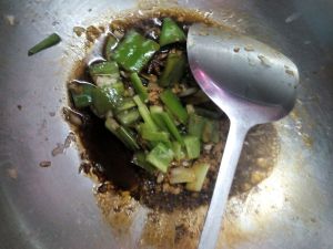 炸茄子的油倒掉、留一点点底油,放肉末炒至变色放葱姜蒜末、辣椒(这一步小火慢慢煸香),煸香后放一勺黄豆酱