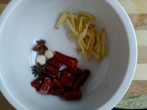 煮开捞出,用凉水冲干浮沫,待用,准备好葱姜大料
