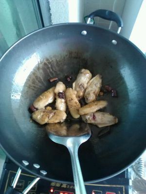 锅里多放电点油,把鸡翅煎一下,至两面变得金黄,主意要不停翻动,不然会粘锅