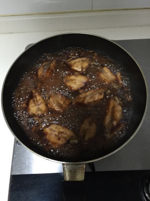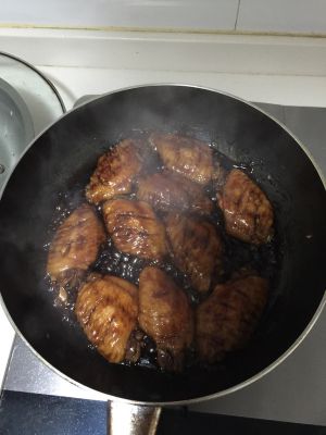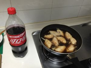 煎至外皮两面泛黄、到入可乐没过鸡翅即可。