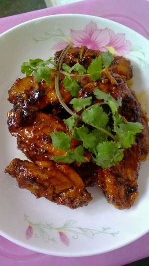 不粘锅中倒入少量橄榄油,下鸡翅煎至两面金黄。下蒜末煸香,立刻喷入少量酱油翻炒均匀,依口味加入适量美极鸡精(因为肉要入味所以鸡精没有放在最后加),白砂糖炒色调味,倒入没过鸡翅量的可乐开炖。