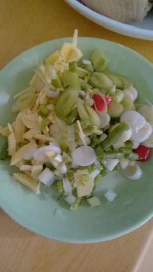 再把姜,葱,大蒜,辣椒切丁。锅里下食用油,等油微热,倒入切好的材料,翻炒到出香味,把中翅倒入翻炒至金黄色,下适量的酱油及盐,更好的调味