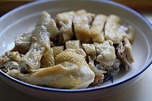 "口水鸡"这名字乍听有点不雅,不过这名字的来历倒却有着文人的温雅。郭沫若在所著《賟波曲》中,有:"少年时代在故乡四川吃的白砍鸡,白生生的肉块,红殷殷的油辣子海椒,想想就口水长流……。"烹调赐拈来"口水"两字,倒成就了大名鼎鼎的"口水鸡"。