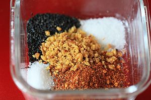 将辣椒粉、炸蒜蓉、糖、盐、黑芝麻放在玻璃的保鲜盒里 注意:因油温高 一定要用玻璃的盒子