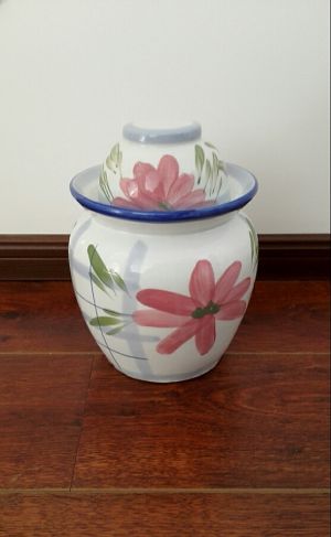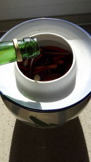 凉干之后在放进坛子,盖上盖在坛子凹槽里放水,放一个星期就大功告成,注:在发酵期间不要开盖。